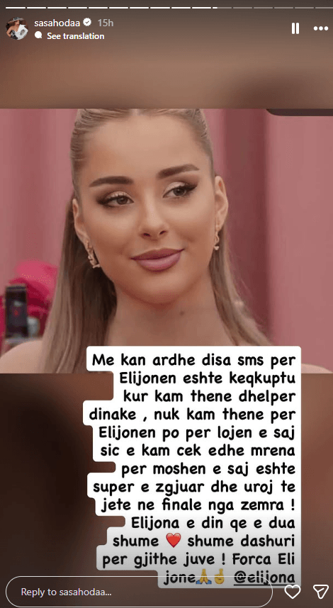 “Kam marrë disa mesazhe lidhur me Elijonën. Është keqinterpretuar shprehja ‘dhelpër dinake’ – ajo i referohej lojës së saj, ashtu siç e kam përmendur edhe brenda shtëpisë”.
