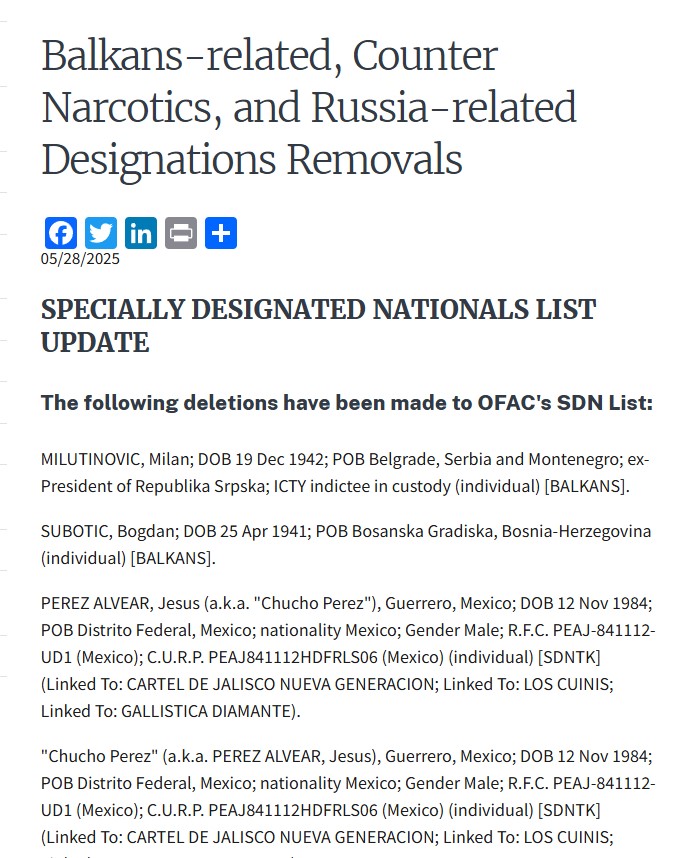 Uashington, 28 maj – Zyra e Kontrollit të Pasurive të Huaja e Departamentit të Thesarit të SHBA (OFAC) ka bërë përditësime në Listën e Personave të Sanksionuar, duke hequr disa individë dhe subjekte të mëparshëm nga lista e sanksioneve.