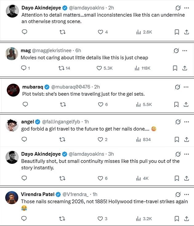 Në X (ish-Twitter), komentet ironike nuk munguan, me përdorues që shkruanin me humor për “udhëtime në kohë”, “thonj nga e ardhmja” dhe “mospërputhje historike”, duke e kthyer momentin në një debat viral për detajet e montazhit dhe autenticitetin e skenave.