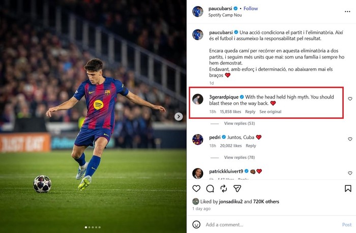 Pique i dërgoi fjalë inkurajuese talentit të ri përmes një komenti në postimin e Cubarsit në Instagram, duke shkruar: “Mbaje kokën lart, mik. Do t’i mposhtësh në ndeshjen e kthimit”.
