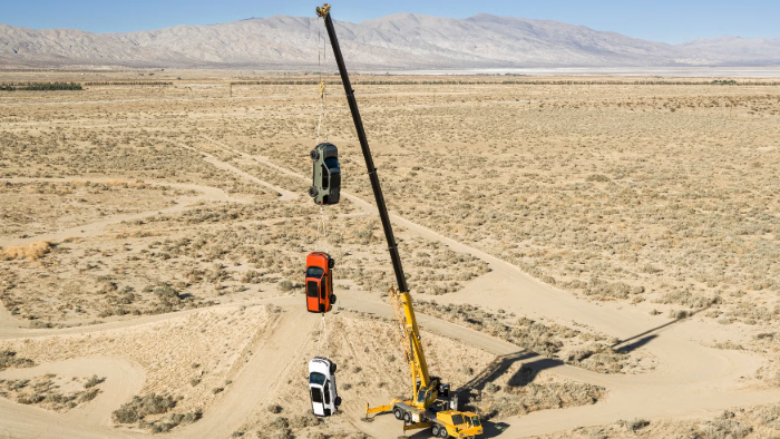 Honda përdori një vinç për të ngritur tre SUV Passport TrailSport në Kaliforni për të provuar se shiritat tërheqës nuk do të dështojnë as në kushte ekstreme.