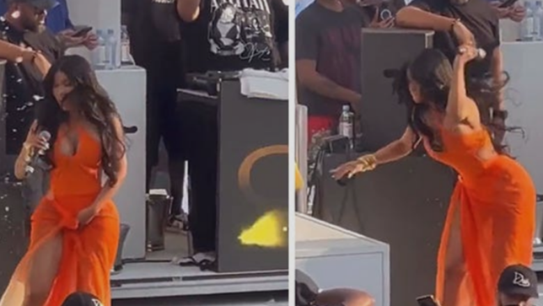 Gruaja thotë se spërkati pak pije drejt saj dhe reperja reagoi me zemërim, duke i hedhur mikrofonin që e goditi në trup.