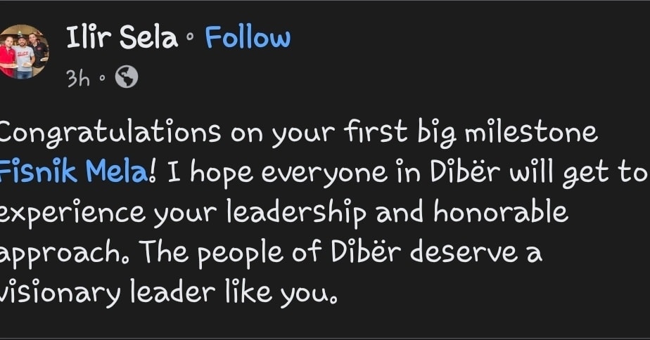 Në një postim në rrjetet sociale, Sela urojë Melen për arritjen e saj të parë të madhe duke thënë: “Urime për arritjen tënde të madhe, Fisnik Mela! Shpresoj që të gjithë në Dibër të kenë mundësinë të përjetojnë udhëheqjen dhe qasjen tënde të ndershme. Njerëzit e Dibrës meritojnë një lider vizionar si ti.”