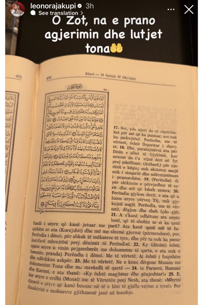 Në imazhin e publikuar shihet libri i shenjtë islam, Kurani, ndërsa Leonora ka bërë me dije se gjatë këtij muaji të shenjtë po i kushton kohë lutjes dhe reflektimit shpirtëror.