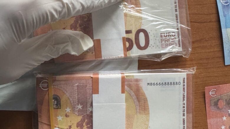 Gjatë kontrollit, u gjetën këto sasi të dyshuara: 500 € – 1 copë, 200 € – 1 copë, 50 € – 101 copë, 20 € – 1 copë, 5 € – 1 copë.