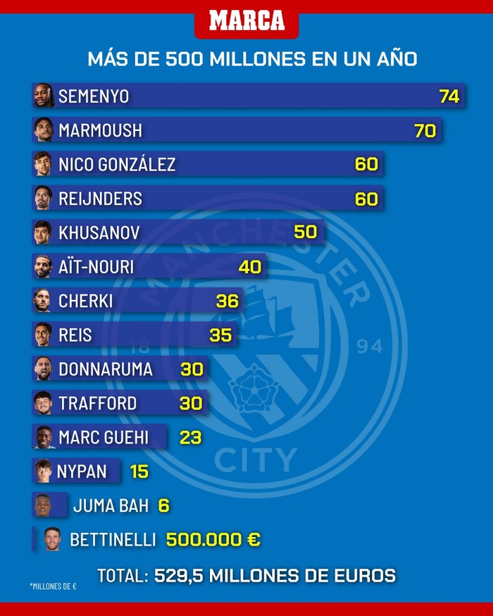 Sipas të dhënave të publikuara nga gazeta Marca, klubi anglez ka investuar 529.5 milionë euro brenda vetëm një viti, duke ndërtuar praktikisht një formacion të ri titullar.