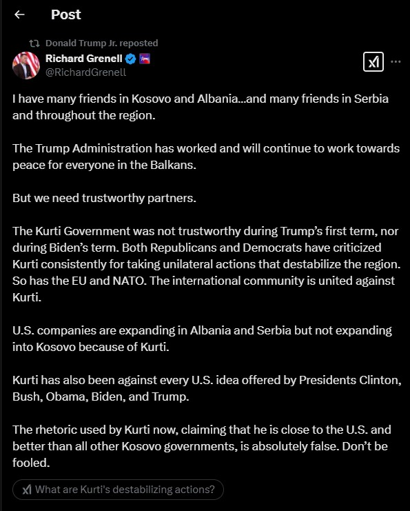 “Administrata Trump ka punuar dhe do të vazhdojë të punojë drejt paqes për të gjithë në Ballkan. Por ne kemi nevojë për partnerë të besueshëm. Qeveria Kurti nuk ishte e besueshme gjatë mandatit të parë të Trump, as gjatë mandatit të Bidenit. Si republikanët ashtu edhe demokratët e kanë kritikuar vazhdimisht Kurtin për ndërmarrjen e veprimeve të njëanshme që e destabilizojnë rajonin. Po ashtu edhe BE-ja dhe NATO-ja. Bashkësia ndërkombëtare është e bashkuar kundër Kurtit”, shkroi Grenell në X.