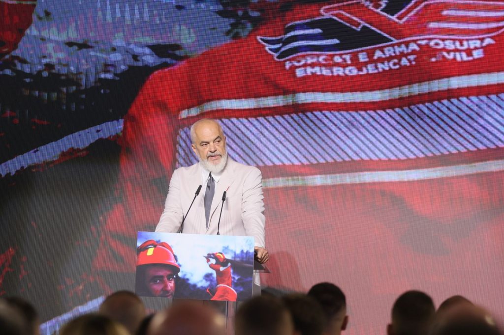 “Jemi këtu për t’u përulur me respekt përpara jush dhe të gjithëve atyre që ju këtu përfaqësoni. Beteja e zjarrit që përfshiu territore të konsiderueshme të vendit në dy muajt e fundit ishte një kronikë e gjatë ethesh, plagësh, dhimbjesh. Një kronikë dramatike por me nota stërmundimi, përkushtimi dhe momente kulmore edhe heroizmi njerëzor që i bëjnë nder uniformave tuaja dhe falë jush nderojnë shtetin shqiptar, lartësojnë republikën tonë”, tha mes të tjerash Rama.