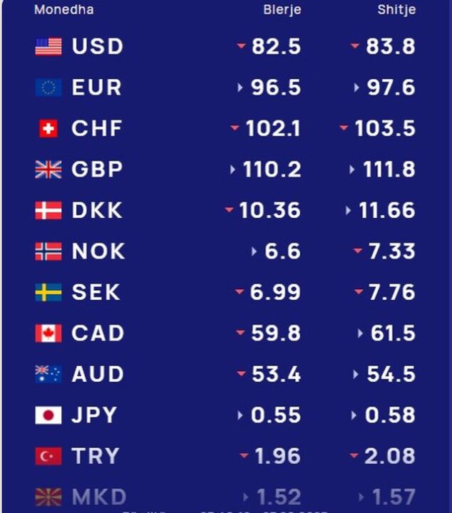 Euro do të blihet me 96.5 lekë dhe do të shitet me 97.6 lekë.