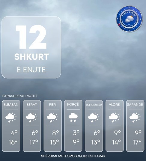 Shërbimi Meteorologjik Ushtarak njofton të Shqipëria të enjten do të ndikohet nga kushte atmosferike kryesisht të paqëndrueshme.