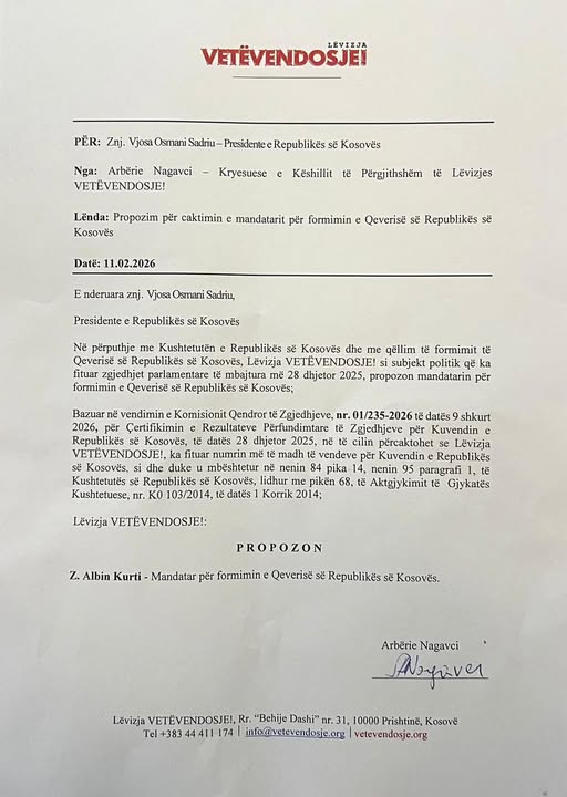 Lëvizja Vetëvendosje ia ka dërguar Presidentes së Kosovës emrin e mandatarit për kryeministër, e që është lideri i tyre Albin Kurti.Këtë e ka bërë të ditur Arbërie Nagavci si Kryesuese e Këshillit të Përgjithshëm të LVV-së.“E nderuar që, në cilësinë time si Kryesuese e Këshillit të Përgjithshëm të Lëvizjes VETËVENDOSJE!, t’i dorëzoj Presidentes së Republikës së Kosovës propozimin për caktimin e z. Albin Kurti si Mandatar për formimin e Qeverisë së Republikës së Kosovës. Bazuar në vullnetin qytetar të shprehur në zgjedhjet e 28 dhjetorit 2025 dhe në përputhje me Kushtetutën e Republikës së Kosovës, vazhdojmë me përgjegjësi institucionale drejt formimit të qeverisë së re. Faleminderit qytetarëve për besimin! Qeveria Kurti 3”, ka shkruar ajo.