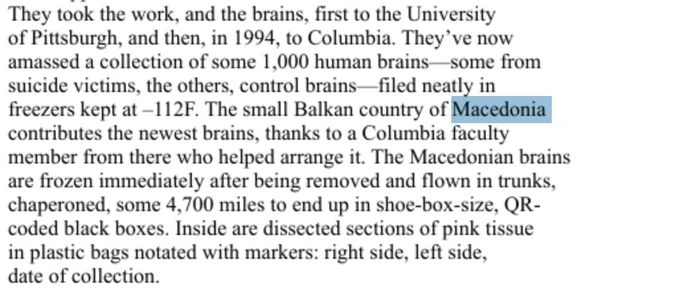 Në pjesën për Maqedoninë, thuhet se “vendi i vogël ballkanik Maqedonia siguron tru të njerëzve falë një anëtari të fakultetit të Universitetit të Kolumbias i cili vjen nga atje dhe ndihmoi në organizimin e të gjithë procesit”.