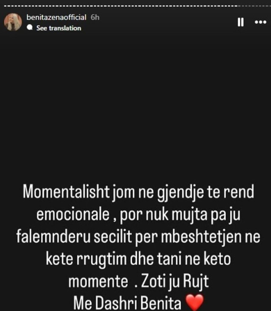 Përmes një InstaStory, Benita ka bërë të ditur se po kalon një gjendje të rënduar emocionale, duke pranuar se eliminimi ka qenë një moment i vështirë për të.