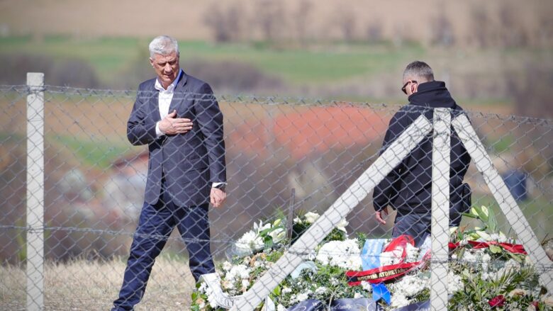 Nën masa të rrepta sigurie, Thaçi shihet duke u afruar te varri i babait të tij, dhe duke vendosur një kurorë lulesh.
