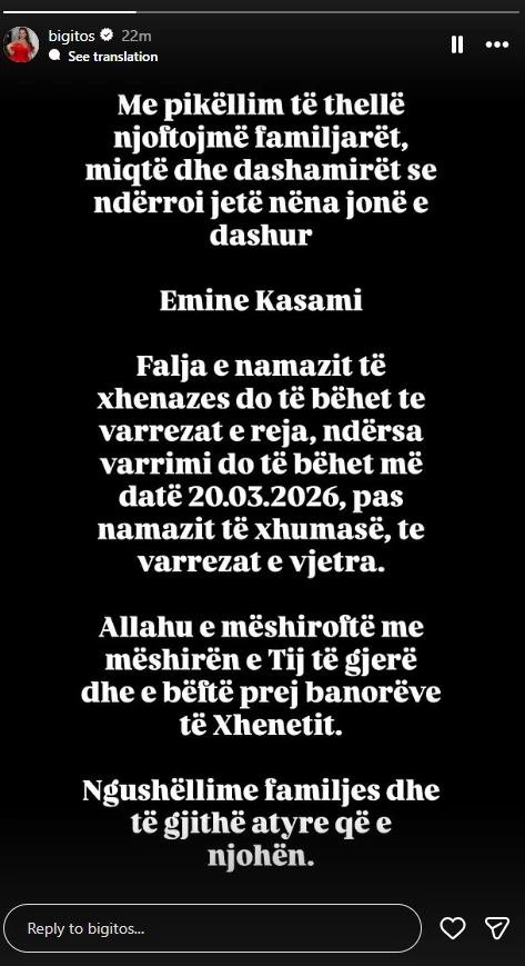 Ajo njofton ndjekësit se varrimi i të ndjerës do të bëhet ditën e nesërme (e premte).