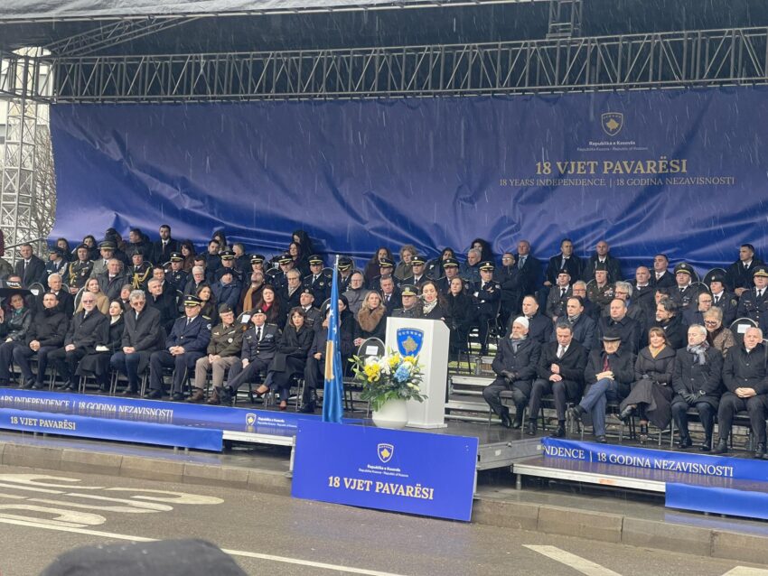 Osmani në vendin kur bëhet parakalimi i trupave të FSK-së dhe Policisë së Kosovës tha se në rrugën “Luan Haradinaj” përballë monumentit “NEËBORN” e krah monumentit “Heroinat” po shënohet 18 vjetori i pavarësisë.