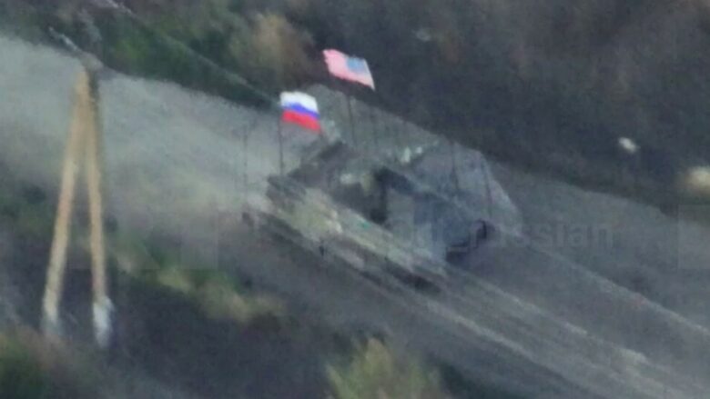 Kanalet ruse të propagandës kanë publikuar një video që tregon automjete të blinduara në lëvizje me flamuj rusë dhe amerikanë.