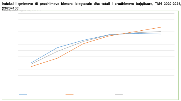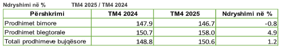 Tutje në njoftim thuhet se në TM4 2025, indeksi i çmimeve të prodhimeve bimore ka rënie për (-0,8 %), krahasuar me periudhën e njëjtë të vitit 2024.
