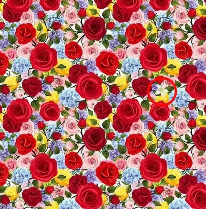Sfida konsiston në gjetjen e një zambaku të bardhë të fshehur mes shumë luleve shumëngjyrëshe në një ilustrim të një kopshti plot me trëndafila dhe lule të tjera.