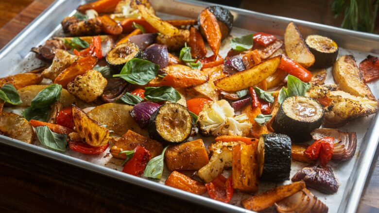 Mbulojeni tavën me letër alumini dhe futeni në furrë për rreth 40 minuta. Më pas hiqni letrën dhe lërini perimet të pjeken edhe për 15 minuta, deri sa të marrin një ngjyrë të artë dhe të zbuten mirë.