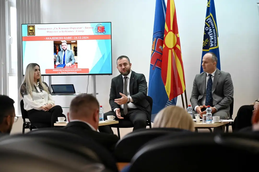 Më herët ministri “piu” “kafenë akademike” tradicionale që mbahet çdo vit me studentët dhe profesorët e Fakultetit të Sigurisë. Pastaj, ai iu përgjigj pyetjeve për të cilat u interesuan studentët dhe profesorët, nga fusha e sigurisë, lufta kundër krimit dhe korrupsionit, reformat e Ministrisë së Punëve të Brendshme dhe sistemi i sigurisë.